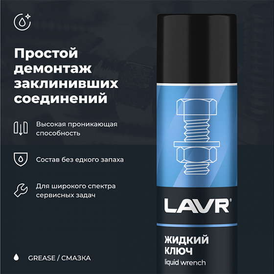 Смазка проникающая Lavr "Жидкий ключ" представляет собой специализированное средство для облегчения демонтажа прикипевших и приржавевших соединений и узлов. Продукт обладает высокой проникающей способностью, благодаря чему действует за 1 – 2 минуты.