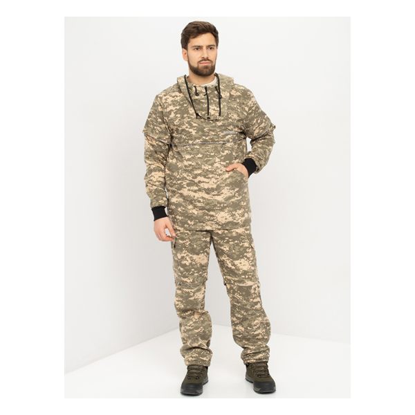 Состоит из куртки и брюк. Куртка с капюшоном и противомоскитной сеткой, убираемой в потайной нагрудный карман. Костюм дополнительно оснащен противоклещевыми ловушками, "юбкой" для исключения доступа к телу для насекомых и пыльников на брюках.