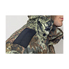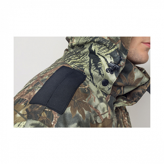 Куртка костюма оснащена застежкой на двухзамковую молнию, защищенную ветрозащитной планкой. Воротник-стойка с приятным на ощупь ворсовым полотном внутри обеспечивает сохранение тепла. Съемный капюшон с козырьком регулируется по форме, а два внутренних и два наружных объемных кармана позволяют разместить все необходимые вещи.