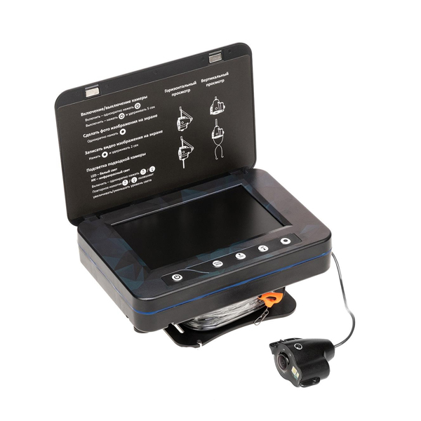 Камера оснащена 5-дюймовым цветным TFT-монитором с разрешением 960х480 пикселей. Высокое разрешение позволяет видеть четкую и яркую картинку даже на глубине 10-15 м при среднем уровне прозрачности воды. Наличие солнцезащитного козырька обеспечивает защиту от бликов на экране.